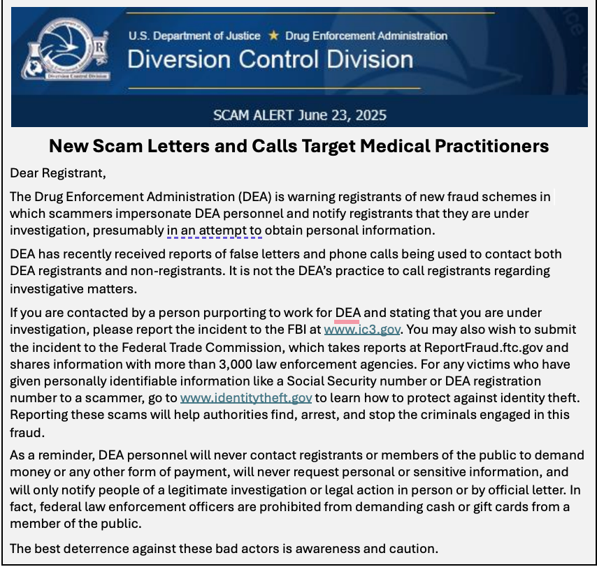 Scammers are impersonating Drug Enforcement Administration (DEA) agents through letters and phone calls, targeting medical professionals in an attempt to steal their identities and money. The scams often involve threats of arrest, prosecution, or revocation of DEA registration as penalty for noncompliance. The scammers may demand payment via wire transfer or gift cards, and may also request sensitive information like social security numbers.